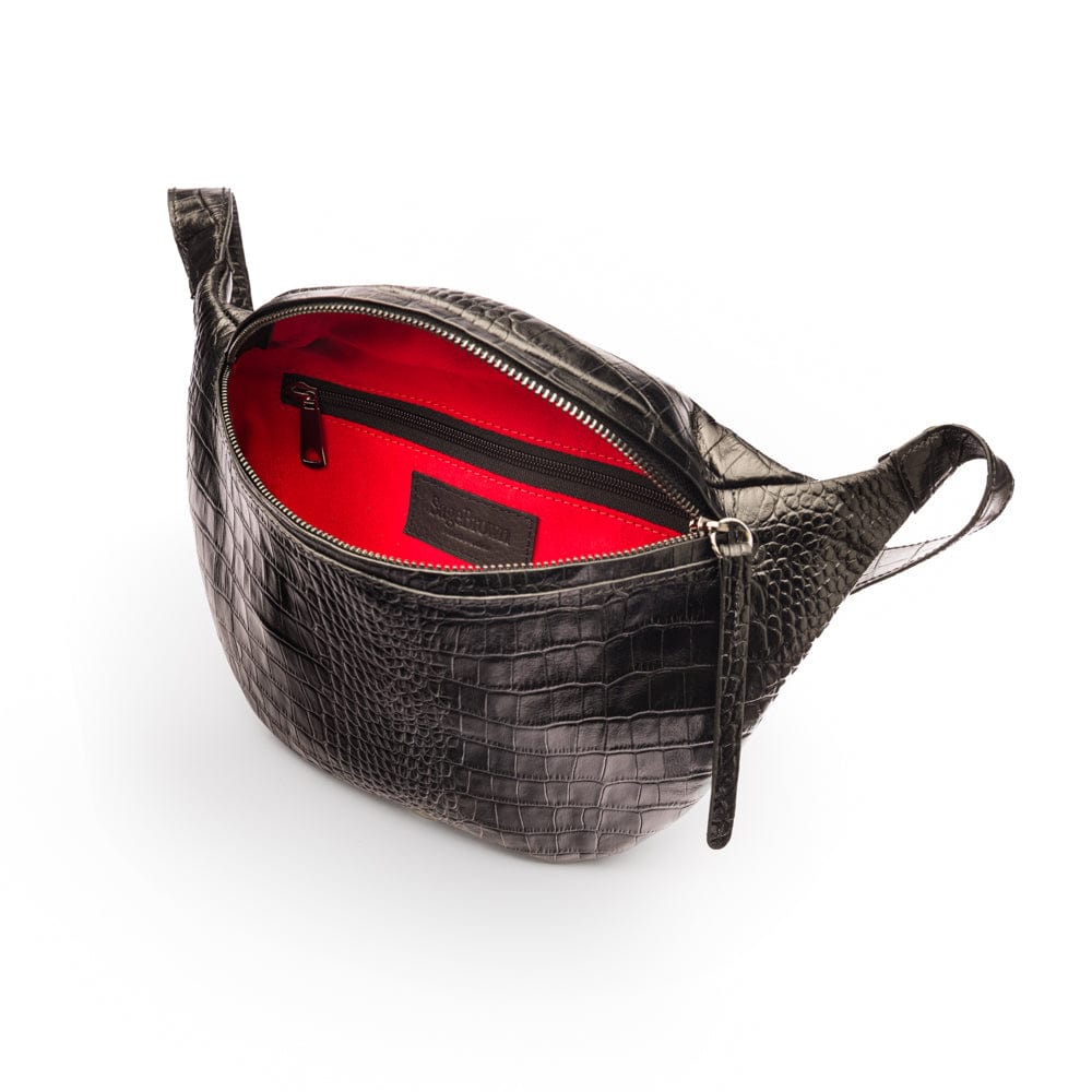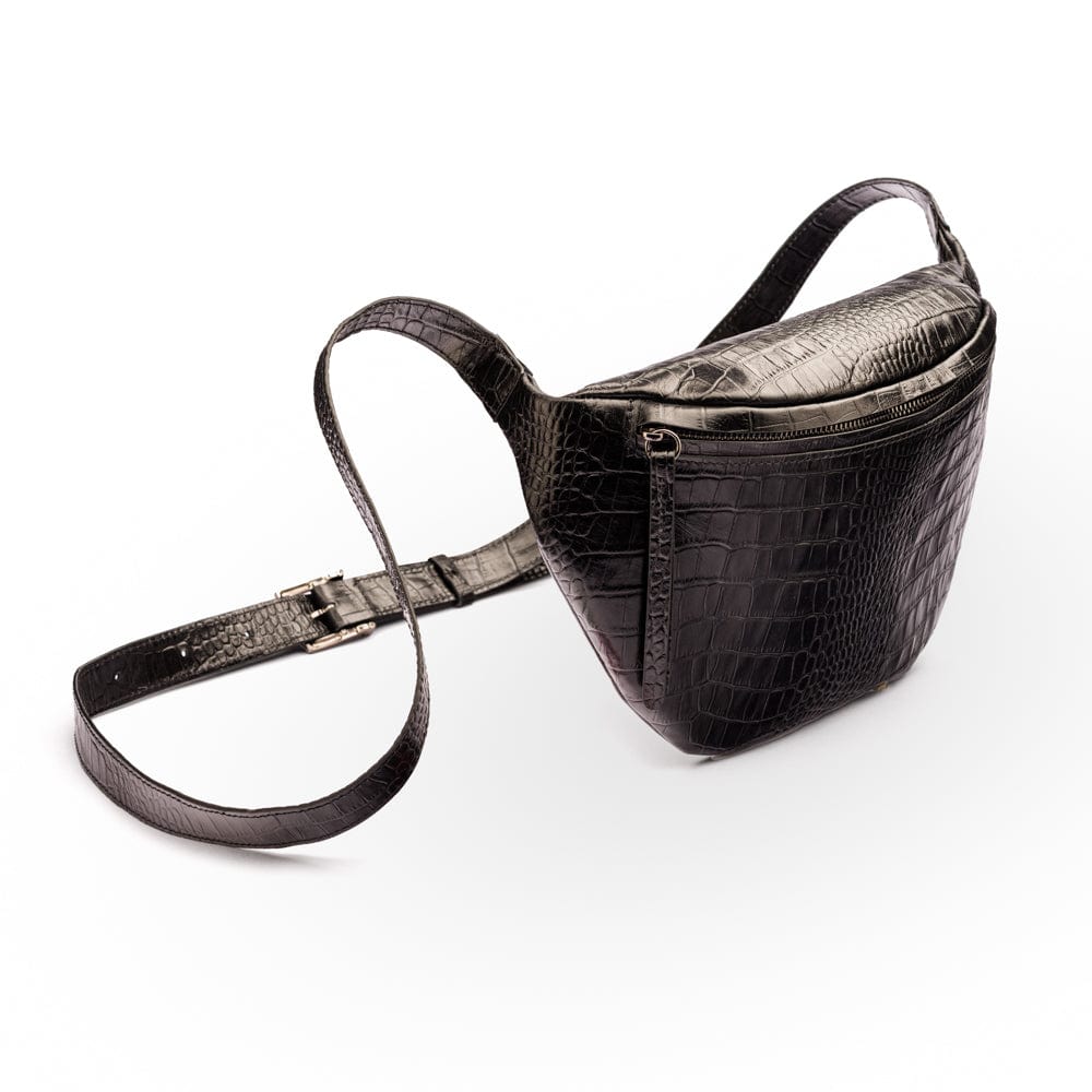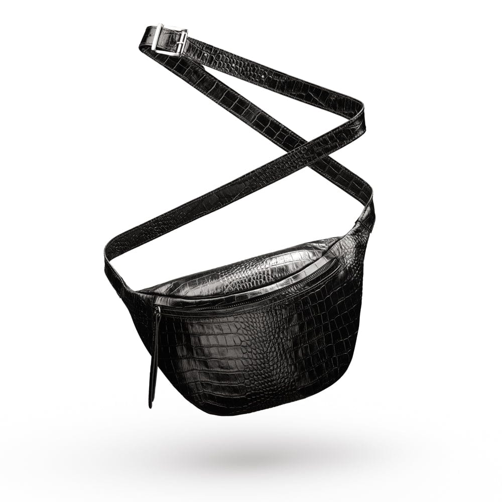 Mens extra long leather belt, black croc, gold buckle