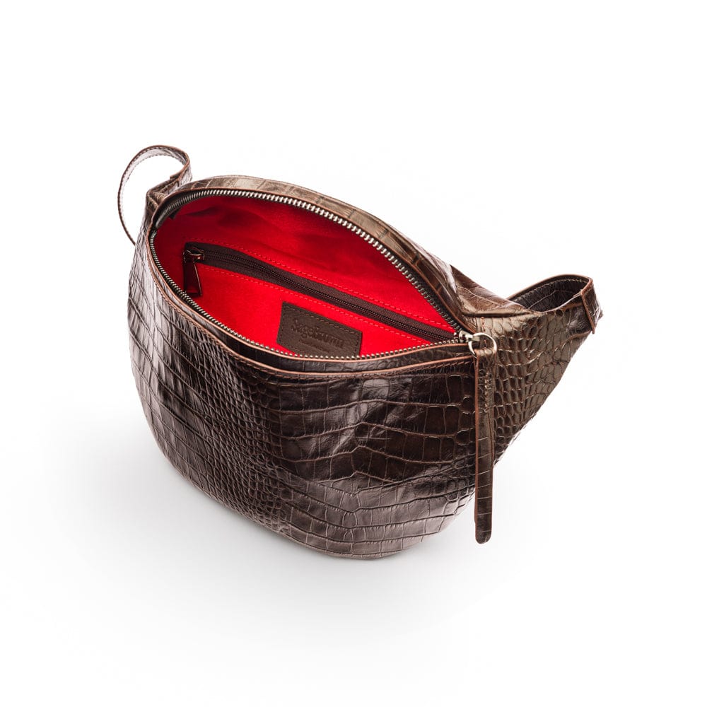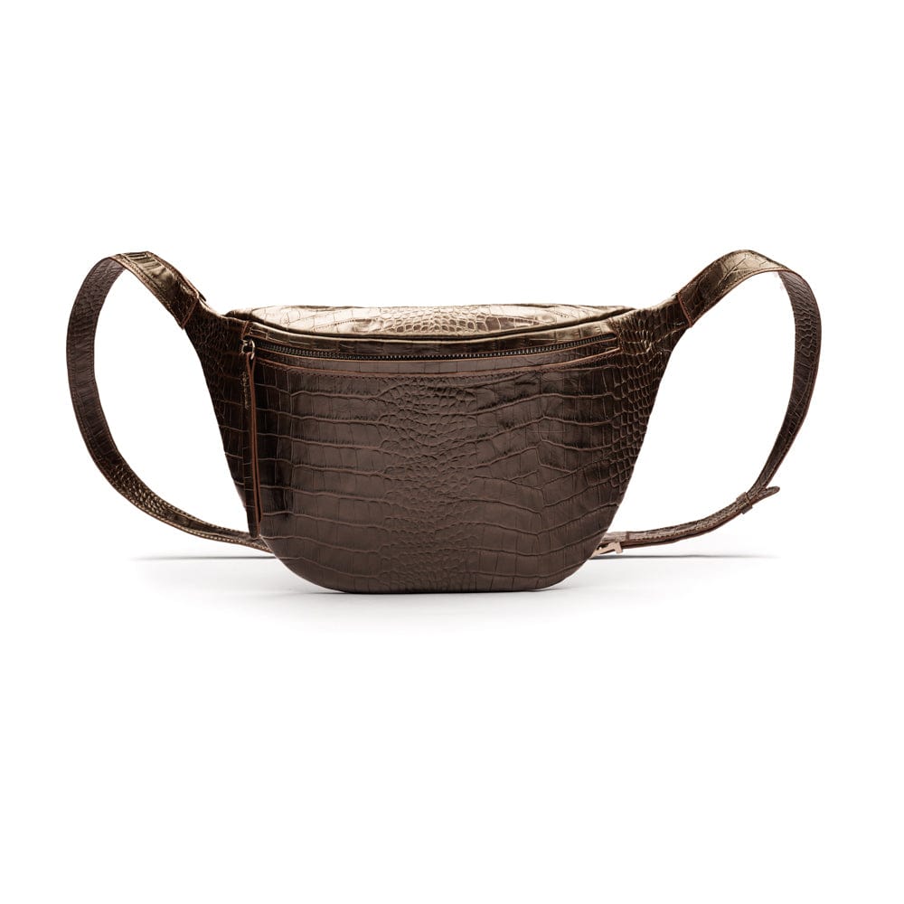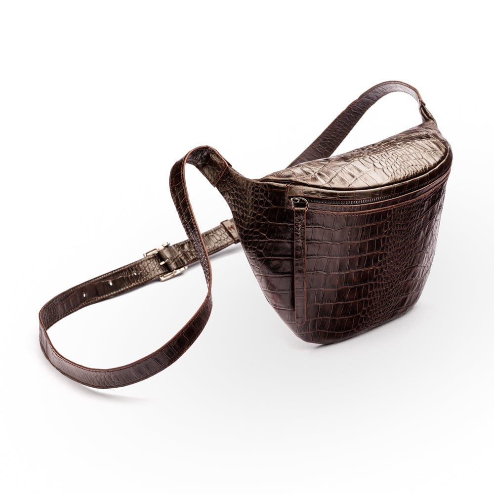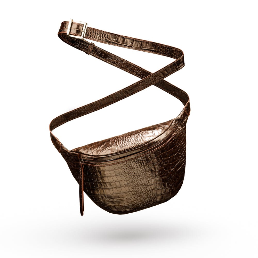 Mens extra long leather belt, brown croc, gold buckle