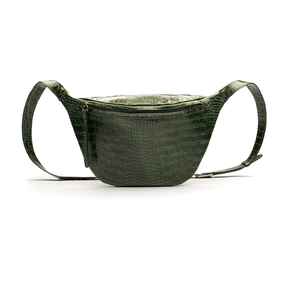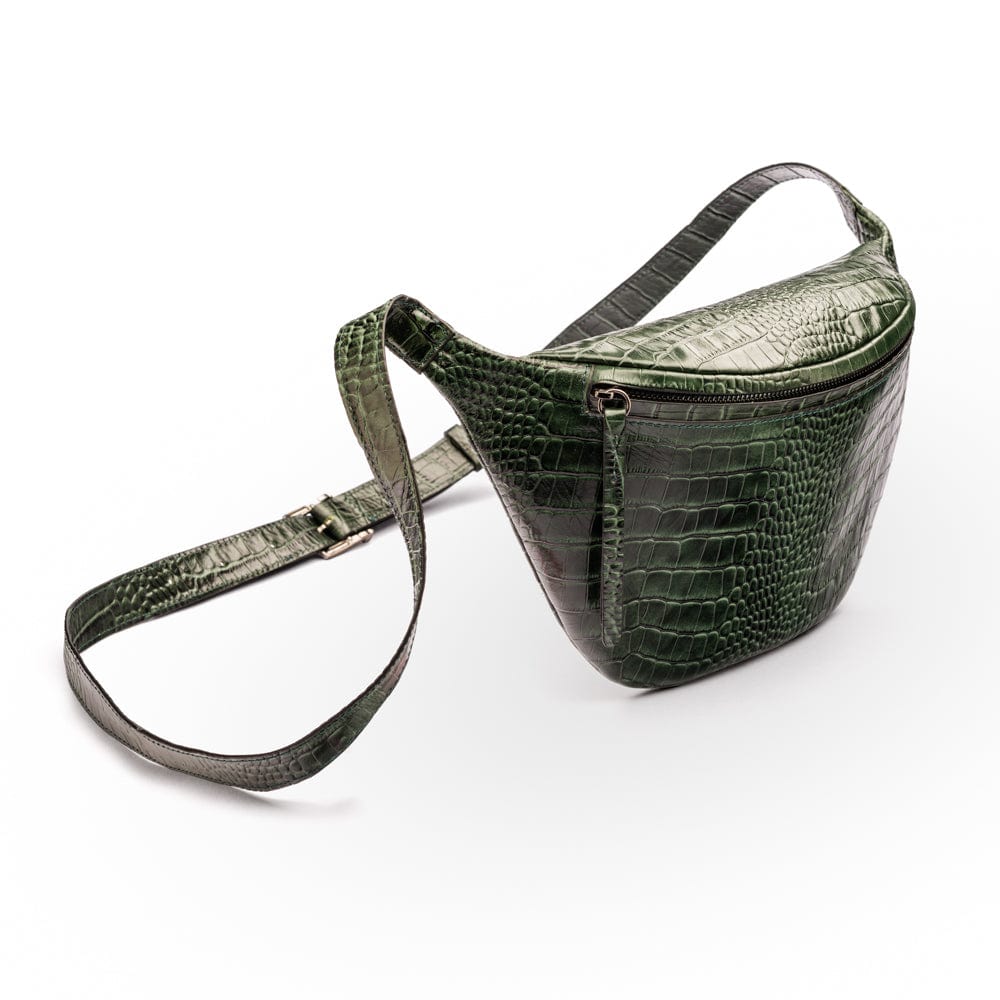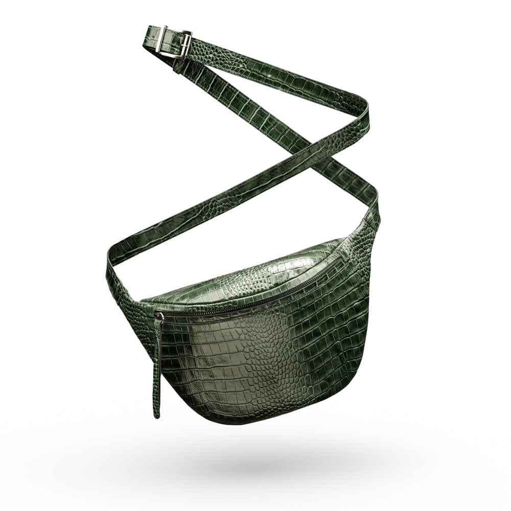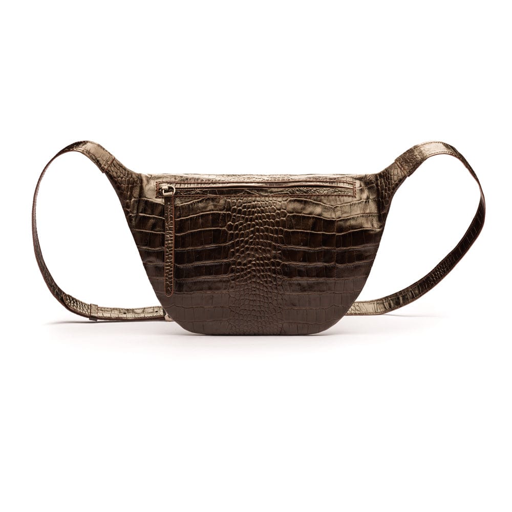 Mens extra long leather belt, brown croc, gold buckle