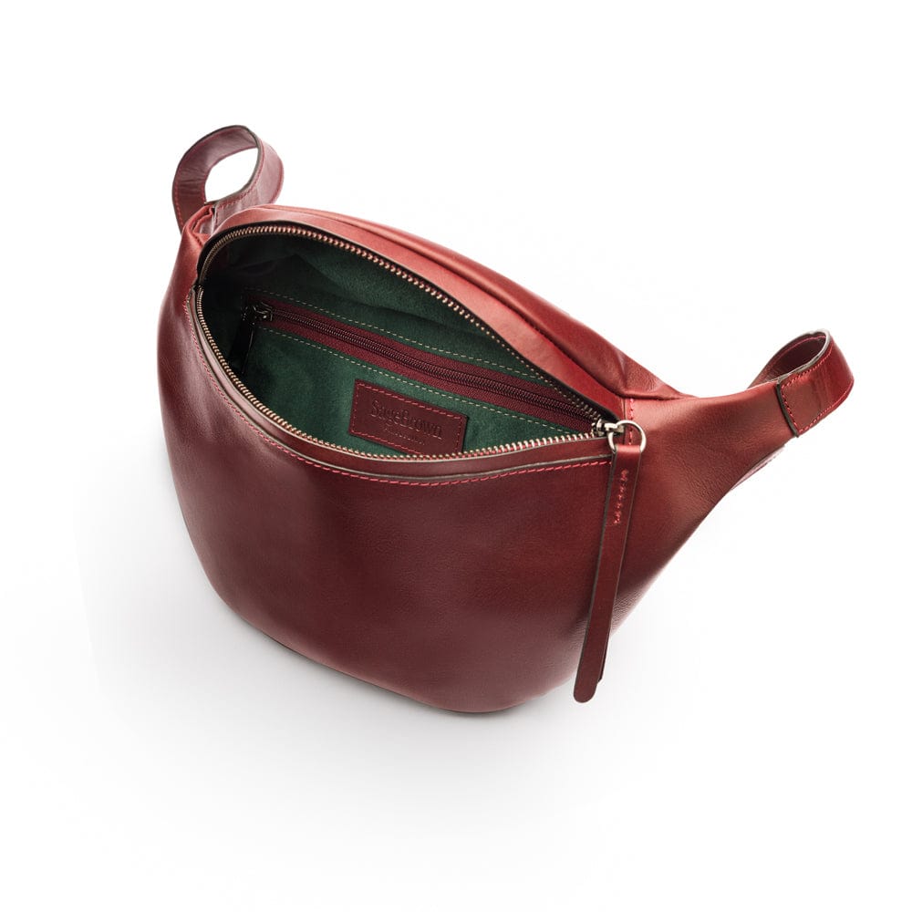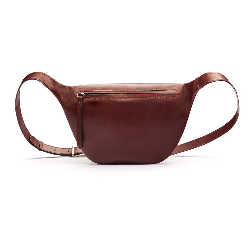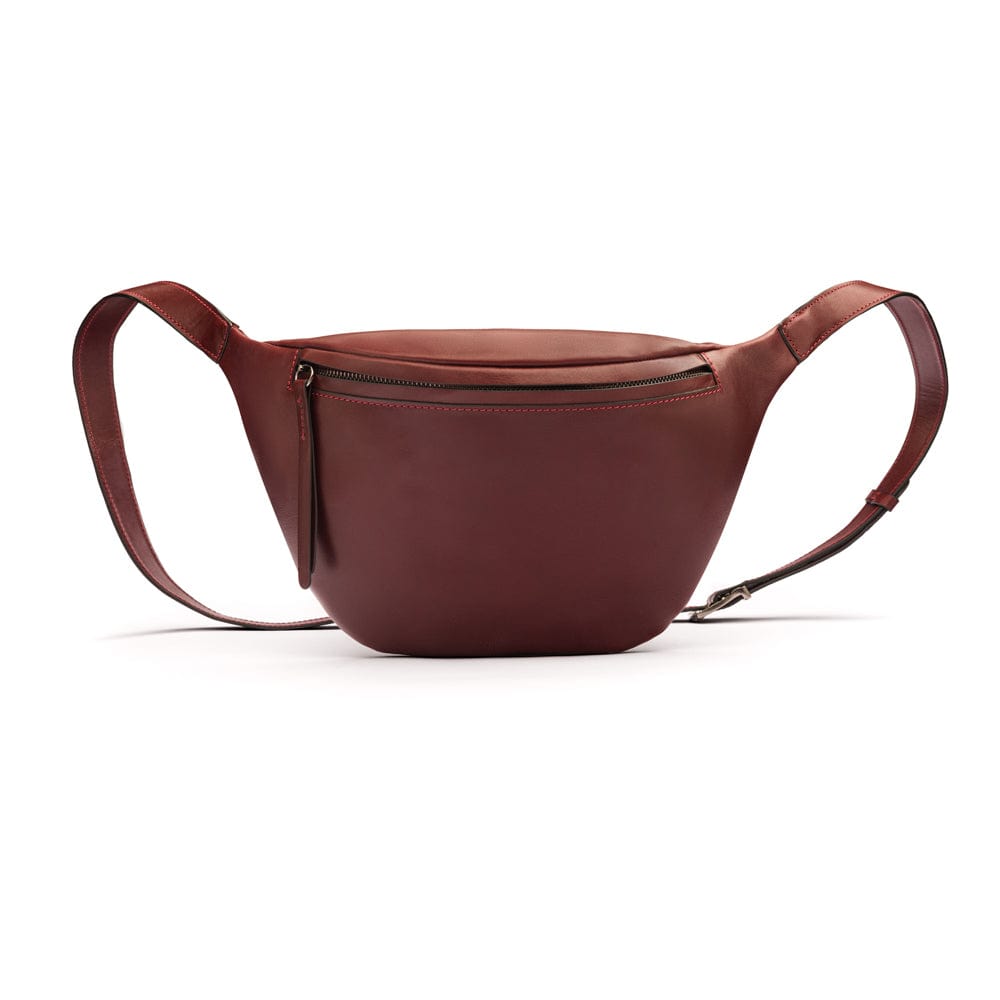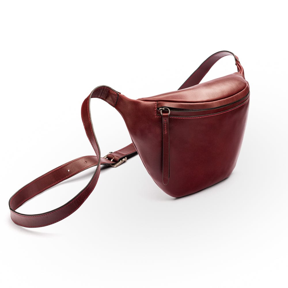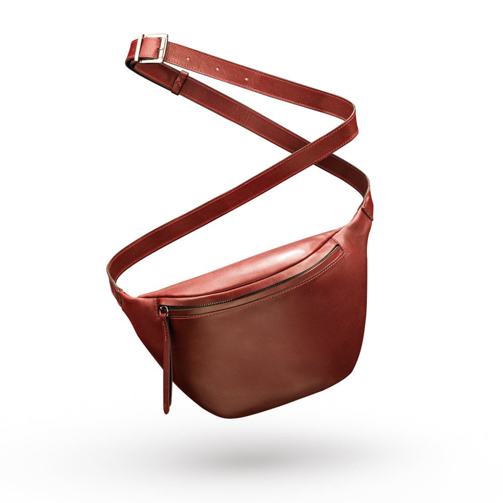 Mens extra long leather belt, burgundy, gold buckle
