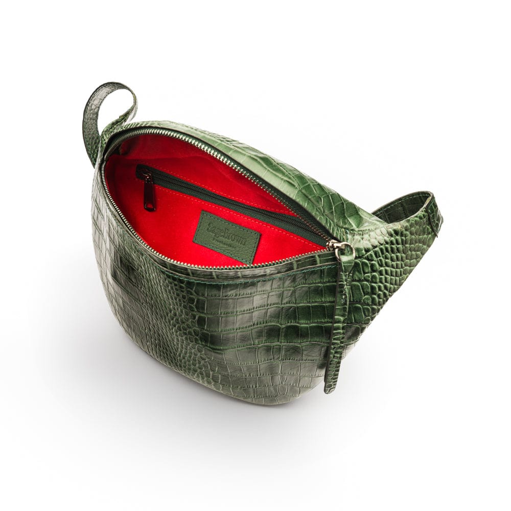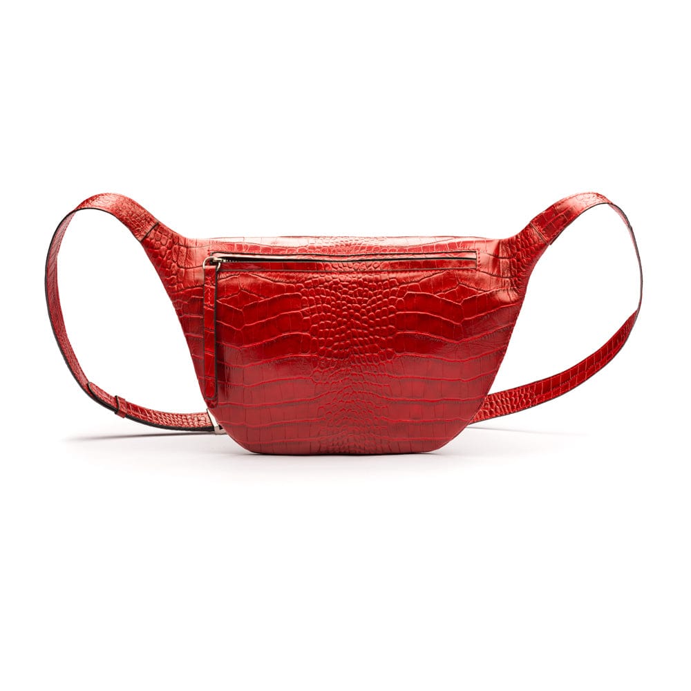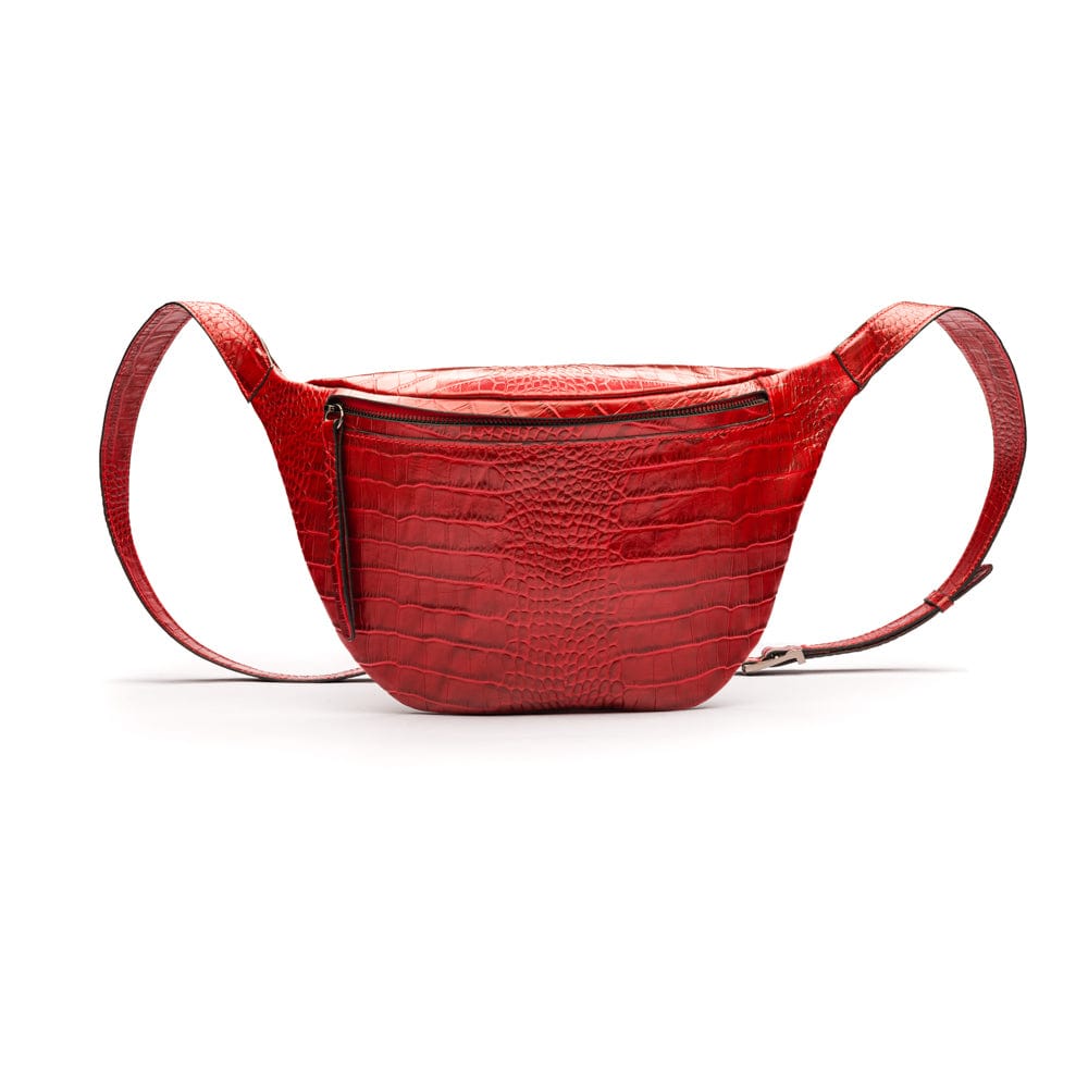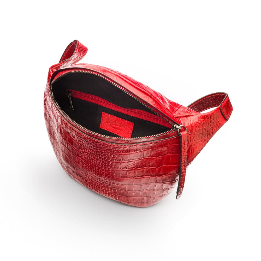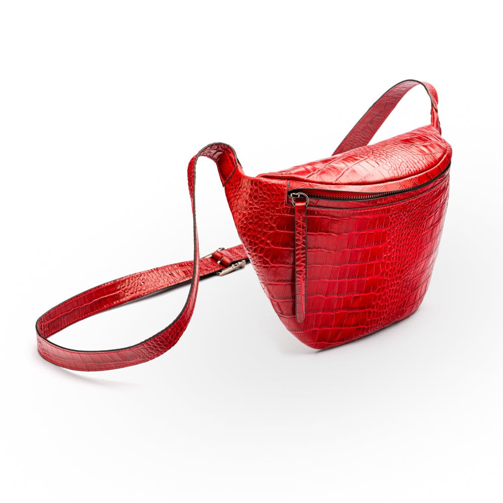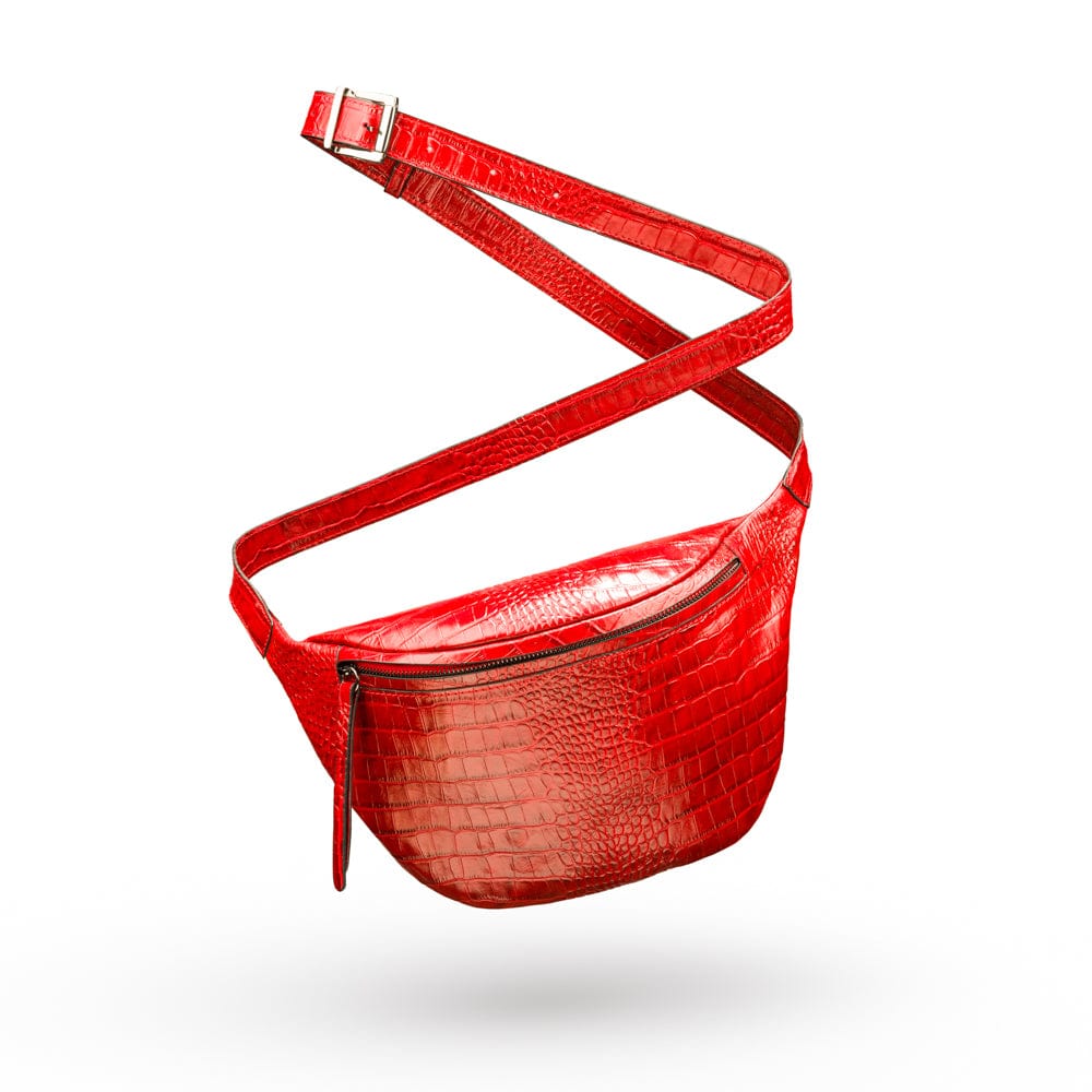 Mens extra long leather belt, burgundy croc, gold buckle