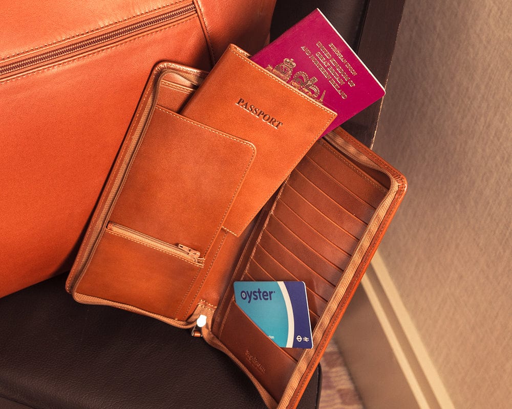Luxury leather travel wallets and travel card holders help you stay organised in style while travelling. They are the perfect place to store tickets, ID, passports, travel documents, and a few essentials cards.